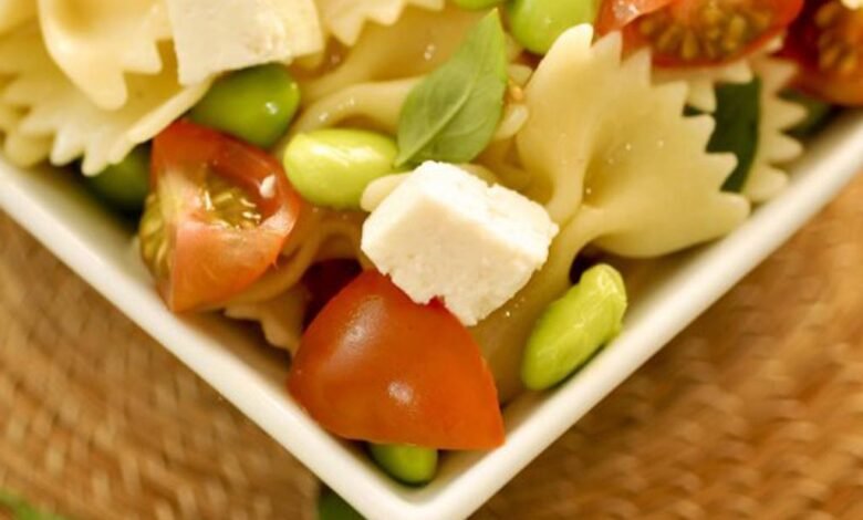 Salada de macarrão com tomatinhos, edamame e queijo branco