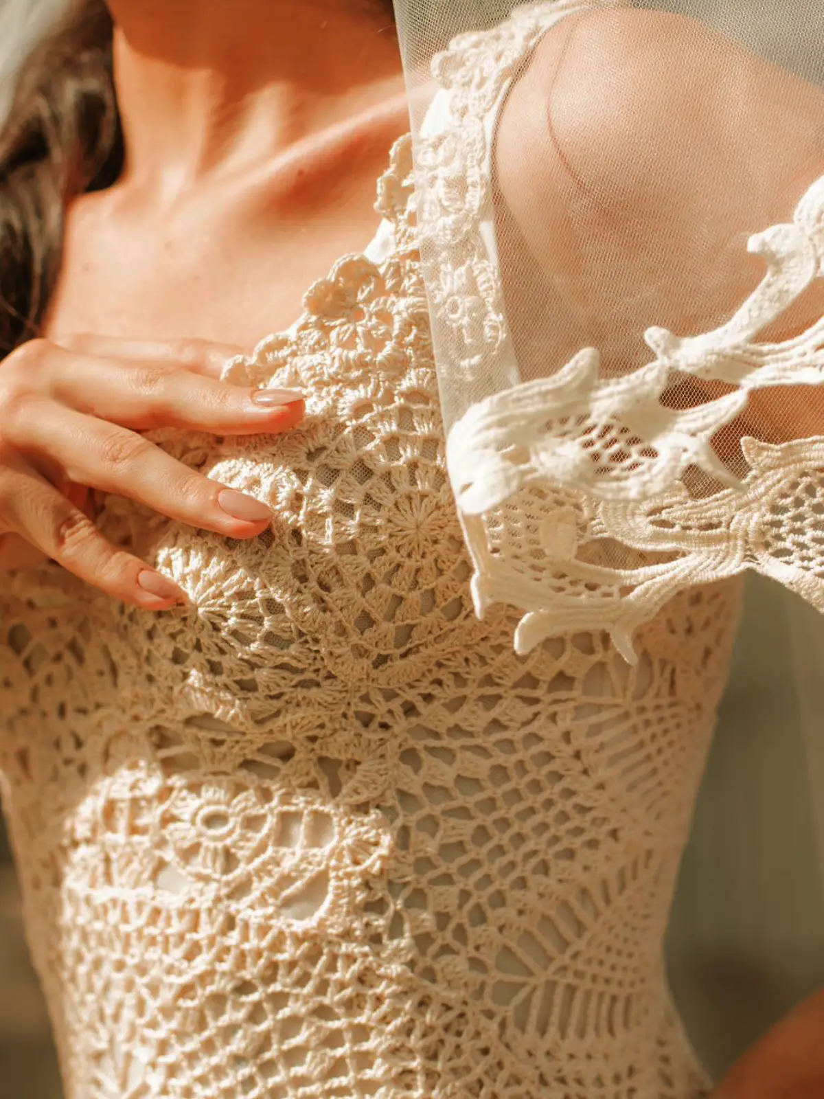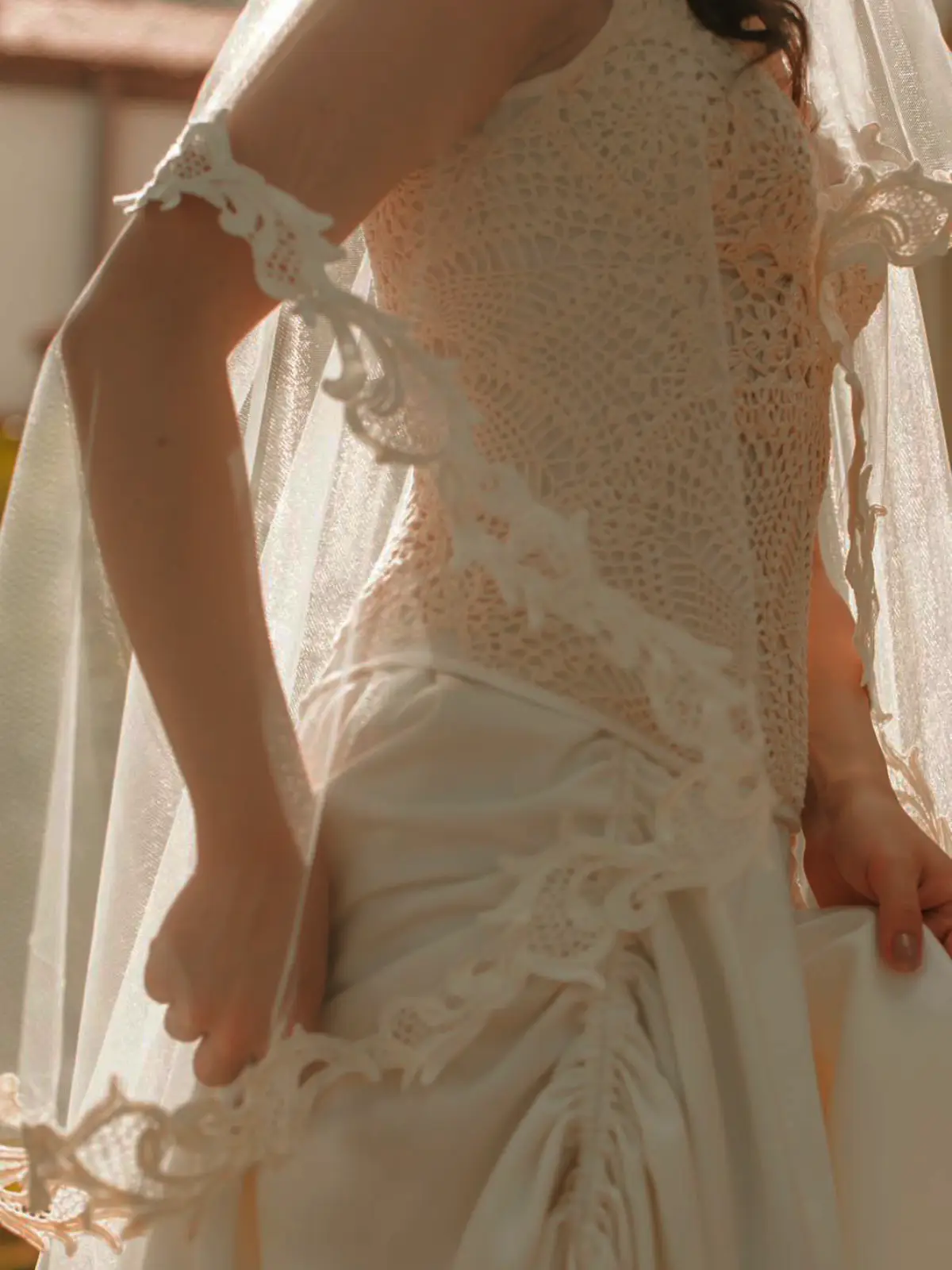 Para finalizar o visual, o vestido recebe uma mantilha em tule leve com acabamento em renda gripir de algodão.