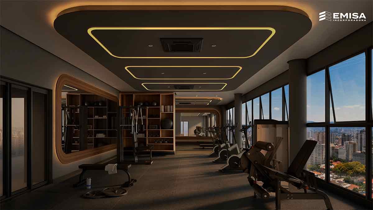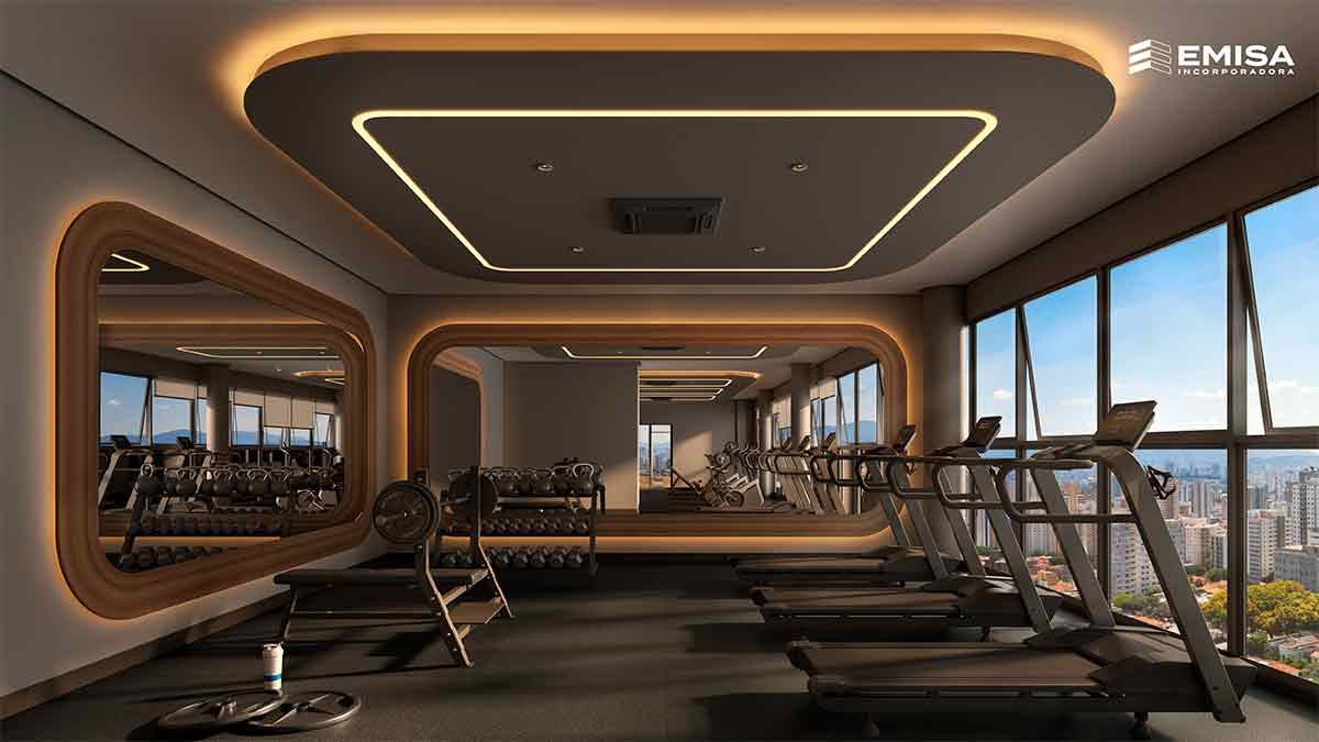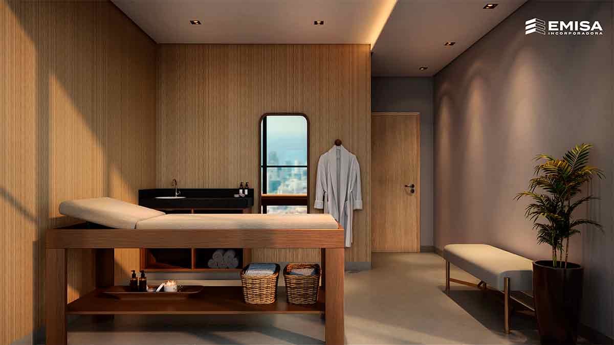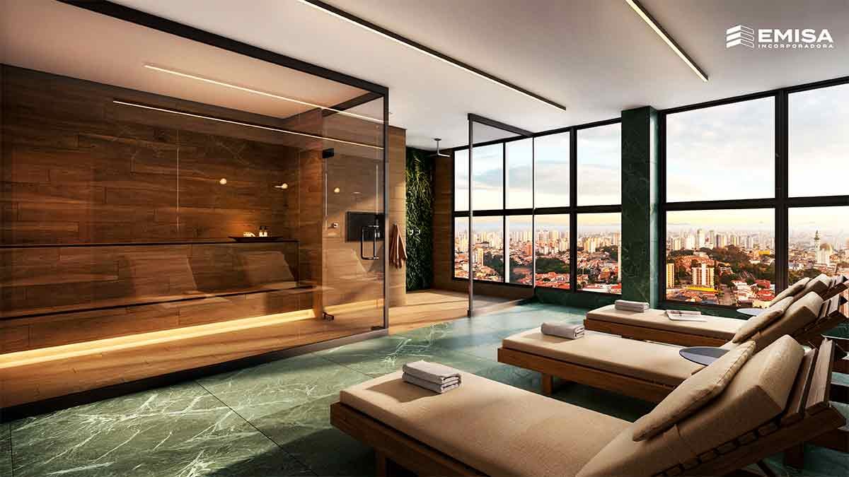 A área externa integra uma academia, sauna e espaço para massagem, todos com varanda para que os moradores possam desfrutar da paisagem durante suas atividades.