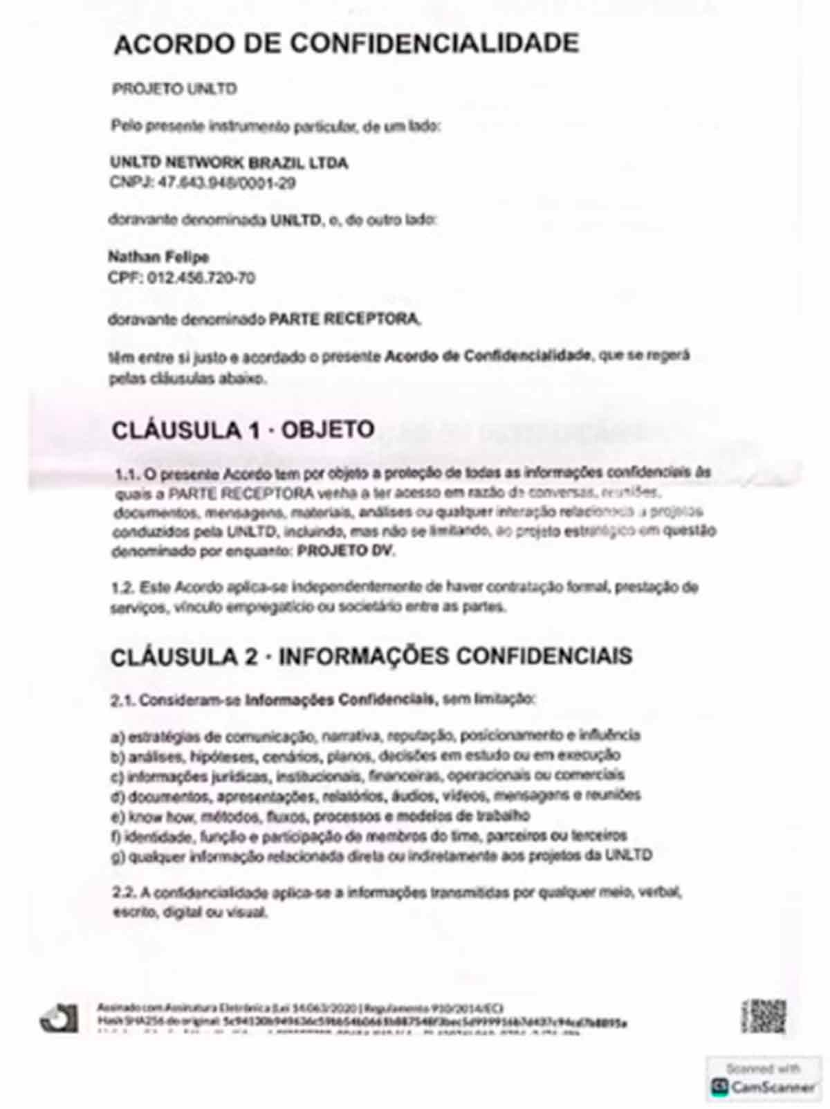 No documento está expresso que o contato da UNLTD se referia ao Projeto DV, em que se define como confidenciais as estratégias de comunicação, narrativas, reputação, posicionamento e influência.