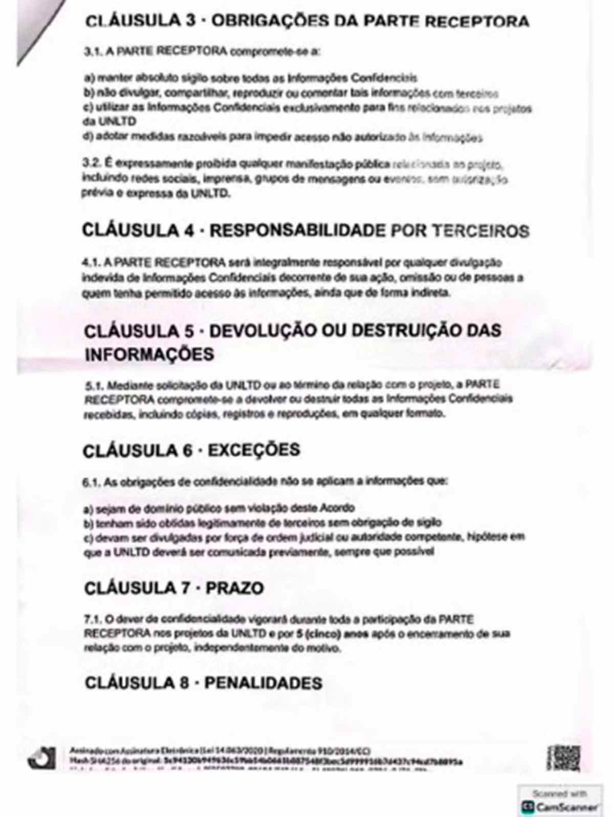 Gabriel divulgou um vídeo nesta manhã contando sobre a abordagem e enviou à equipe do blog documentos recebidos pela agência, incluindo um contrato de confidencialidade assinado pelo assessor, com multa de R$ 800 mil caso fossem divulgadas as informações repassadas pela UNLTD.