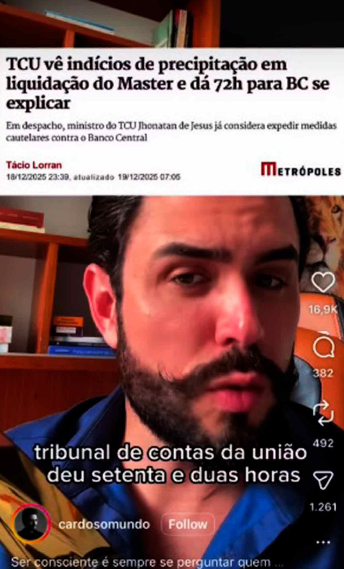 Além da reportagem, também foram enviados alguns exemplos de influencers que, segundo o que foi relatado, já estavam embarcados na missão com as respectivas postagens — todas destacando a ação do TCU, falando em precipitação do BC e sugerindo que o Master foi liquidado por ter crescido rápido demais e incomodado os grandes bancos.