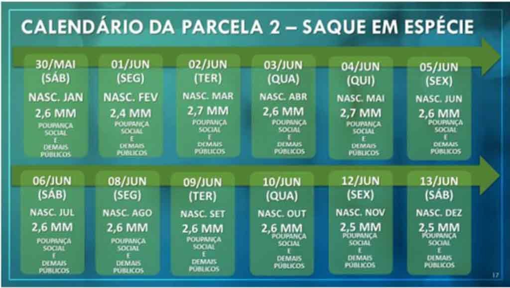 Os beneficiários nascidos nos meses compreendidos de janeiro a junho já contam com a possibilidade de saque em espécie. A partir deste sábado, será a vez dos nascidos em julho, que poderão sacar a segunda parcela nas máquinas de autoatendimento ou nas unidades lotéricas.