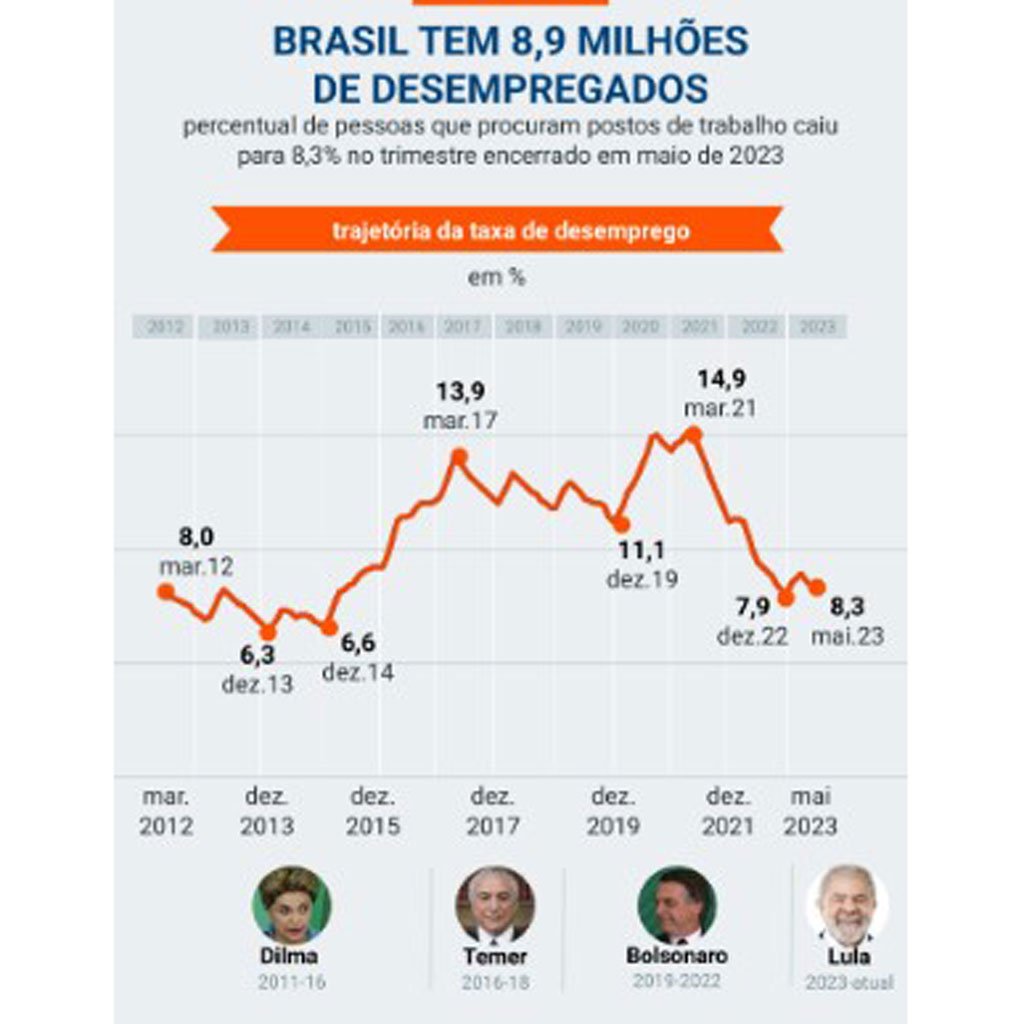 A taxa de desemprego do Brasil atingiu 8,3% no trimestre encerrado em maio de 2023, um recuo de 0,3 ponto percentual em relação ao trimestre encerrado em fevereiro de 2023 (8,6%). Em números absolutos, há 8,9 milhões de desempregados no país.