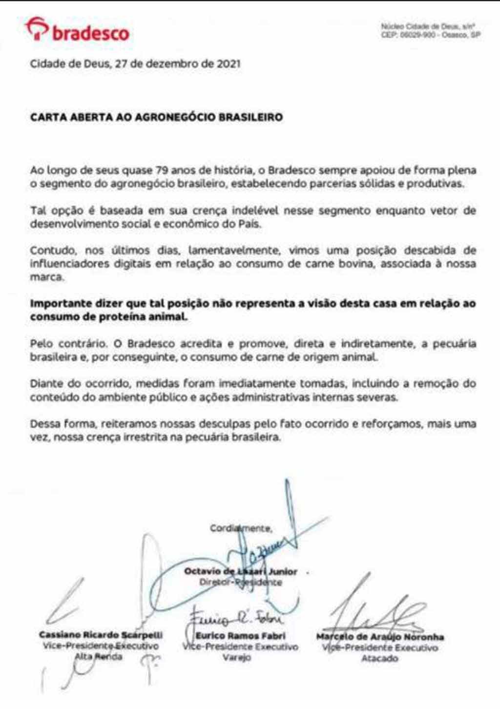 O Bradesco lançou uma campanha em prol do meio ambiente e caiu no erro de dar dicas, entre elas, a de redução de consumo de proteína animal – a carne, propriamente dita.