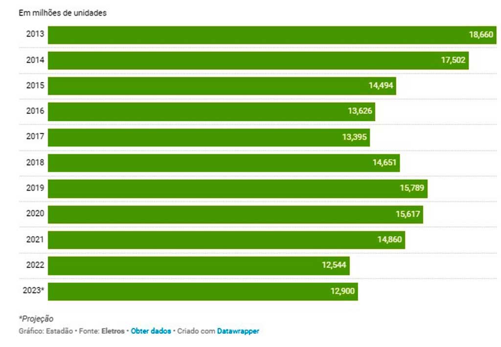 Dados da Eletros mostram que 2023 termina com segundo menor volume de fogões, geladeiras e lavadoras produzidas dos últimos dez anos. São 12,9 milhões de unidades, um volume apenas 3,2% maior em relação a 2022, quando foram fabricados 12,5 milhões de eletrodomésticos.