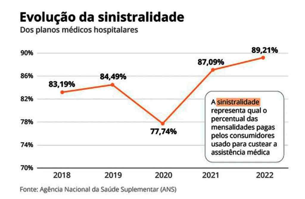 O percentual das receitas com mensalidades gasto com a assistência (a chamada sinistralidade), aumentou 2,1 pontos percentuais de 2021 para 2022 e chegou a 89,21%.
