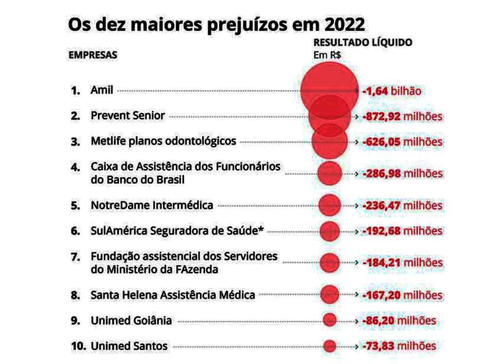 A empresa que registrou o maior prejuízo em 2022 foi a Amil, com resultado negativo em R$ 1,6 bilhão. No segundo lugar desse ranking está a Prevent Senior, com prejuízo de R$ 872 milhões, seguida pela Metlife (-R$ 626 milhões). A Unimed-Rio, que acumulava prejuízo de R$ 1,3 bilhão até o terceiro trimestre, não aparece no ranking porque não entregou os dados do quarto trimestre.