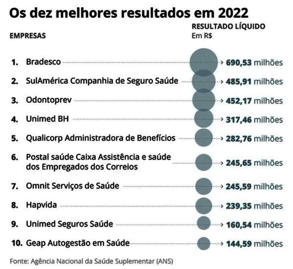 das empresas com melhores resultados está a Bradesco Saúde, com lucro de R$ 690,53 milhões — não por acaso, a empresa que tem maior reserva do segmento —, seguida por SulAmérica (R$ 485,91 milhões) e Odontoprev (R$ 452,17 milhões).