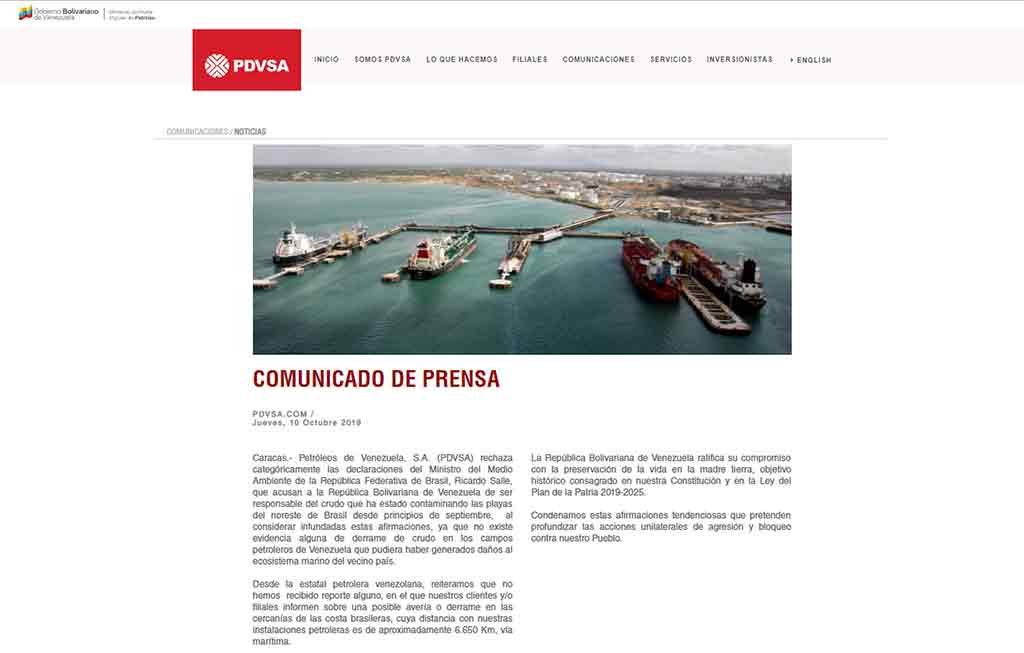 “Petróleos da Venezuela, S.A. (PDVSA) rechaça categoricamente as declarações do Ministro do Meio Ambiente da República Federativa do Brasil, Ricardo Salles, que acusa a República Bolivariana da Venezuela de ser responsável pelo petróleo bruto que polui as praias do Nordeste do Brasil desde o início de setembro, considerando essas alegações infundadas, uma vez que não há evidência de derramamentos de óleo nos campos de petróleo da Venezuela que poderiam ter causado danos ao ecossistema marinho do país vizinho.”