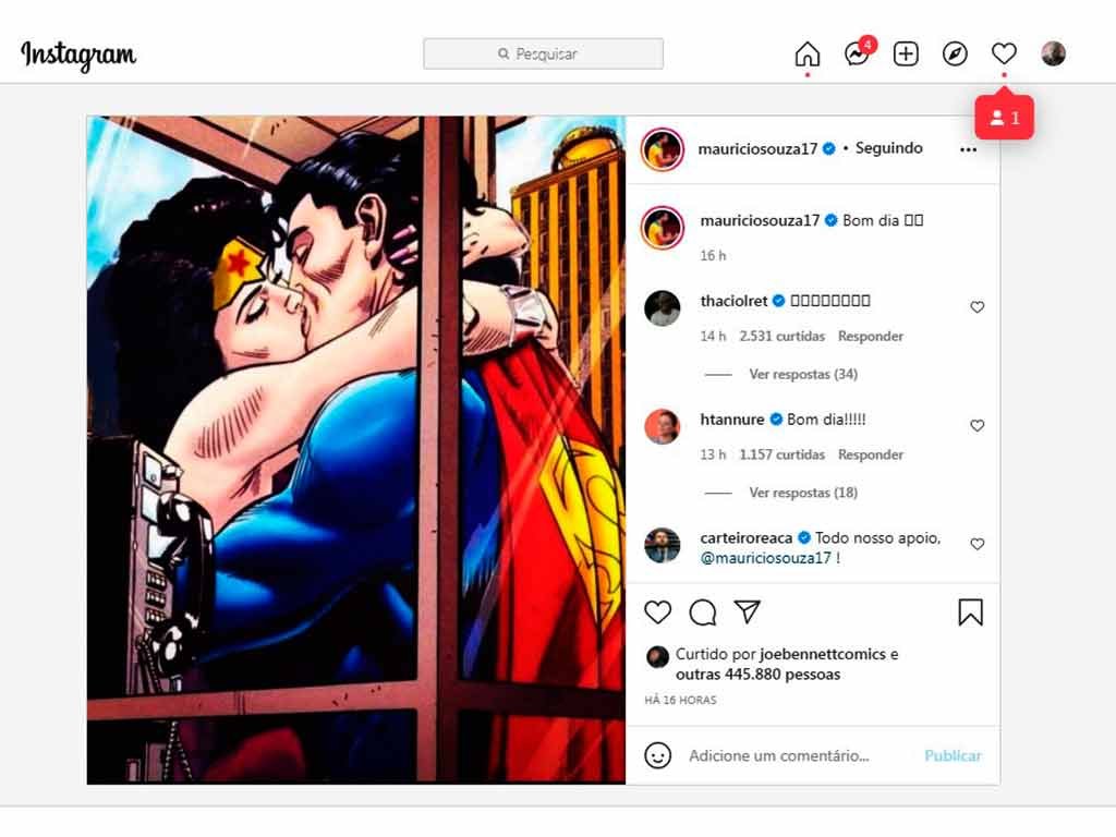 Na manhã de hoje, Mauricio Souza publicou uma imagem do Super-Homem beijando a Mulher Maravilha e escreveu: “Bom dia”.