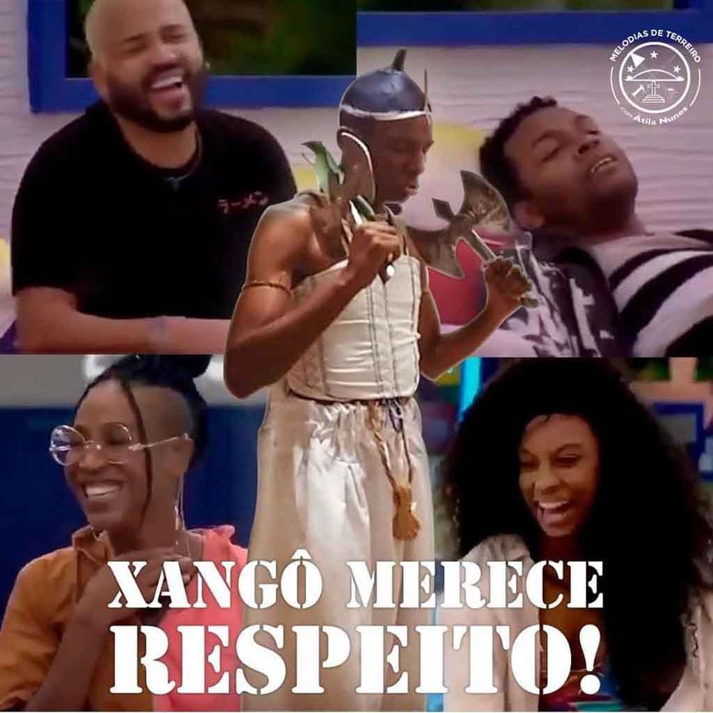 “Eu só espero que Xangô,o senhor da Justica, atenda o chamado desrespeitoso destes quatro para o jogo e leve em conta que eles estão tripudiando do filho dele. Num país em que a intolerância religiosa mata pais e mães de santo, adeptos de religiões de matriz africana, presenciamos quatro pessoas negras, uma delas se diz iniciada, fazendo chacota da fé de um ex-participante. Sera desequilíbrio ou cada um está equilibradamente vomitando sua verdade?”.