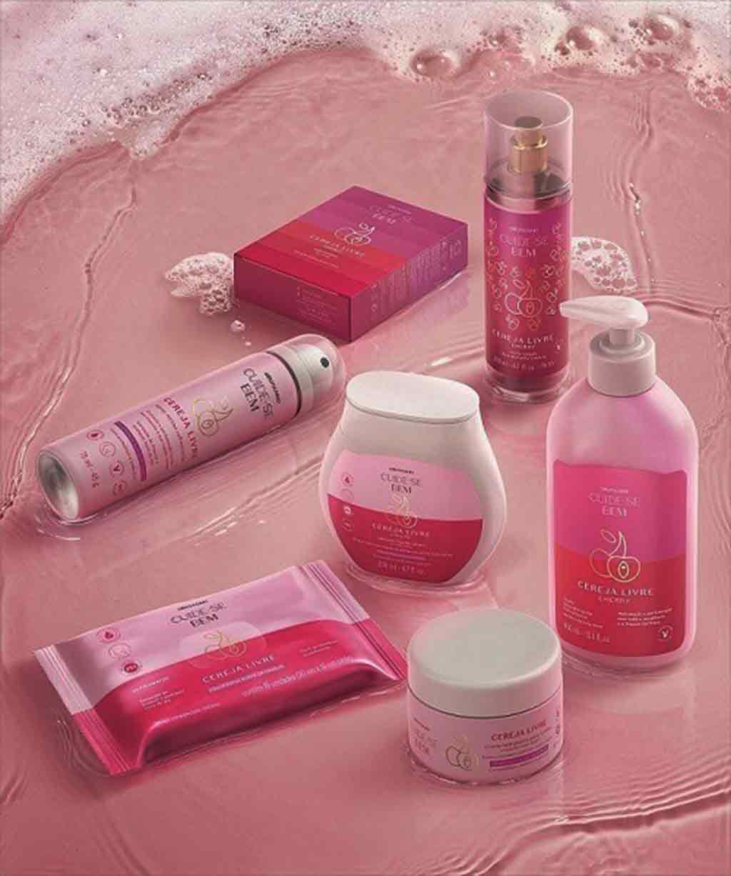 a linha Cuide-se Bem Cereja Livre apresenta a loção hidratante nas versões 400 ml e 200 ml, proporcionando pele macia por até 48h, além de rápida absorção e toque aveludado; o body splash para reforçar a marcante perfumação que combina cereja, mandarina e sândalo; e o sabonete em barra, que também auxilia em manter o corpo hidratado.