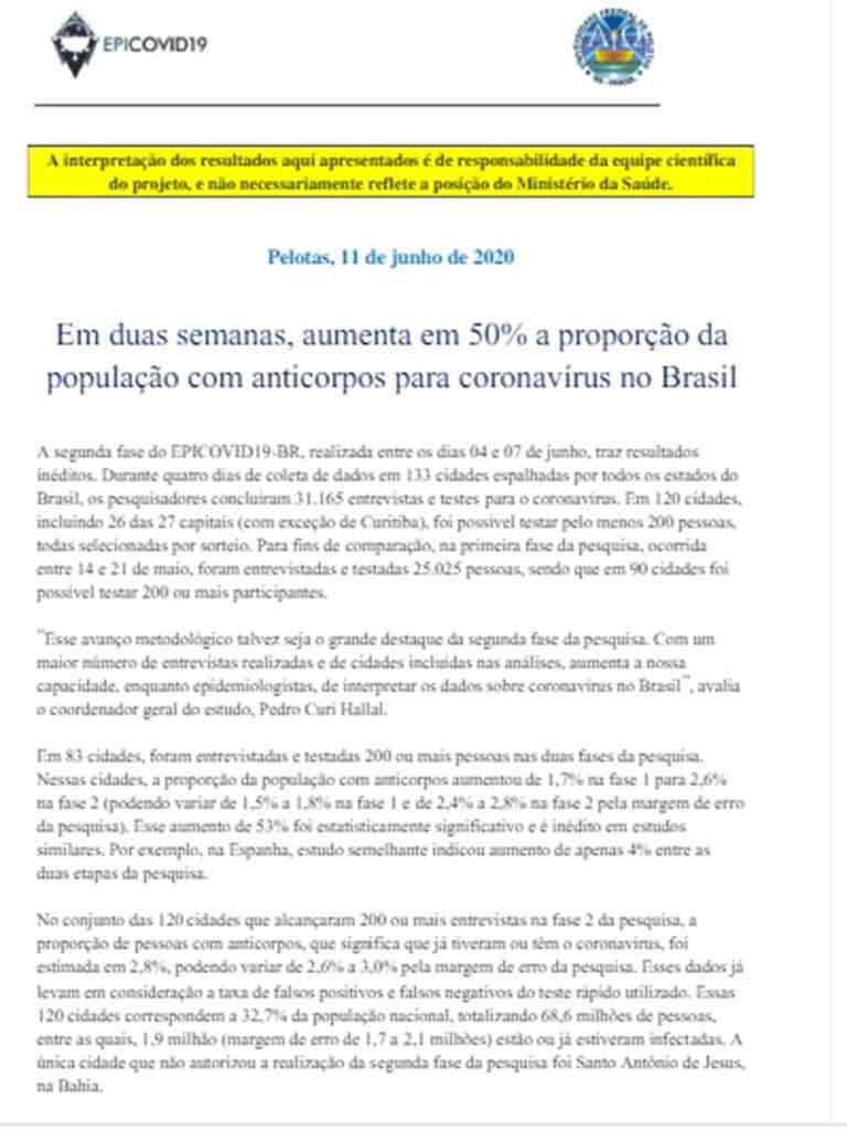“Evolução da Prevalência de Infecção por Covid-19 no Brasil: Estudo de Base Populacional (Epicovid19-BR)”, financiada pelo Ministério da Saúde.