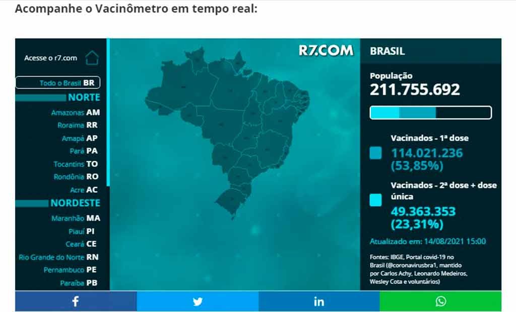 O Vacinômetro do R7 mostra que mais de 114 milhões de pessoas receberam a primeira dose da