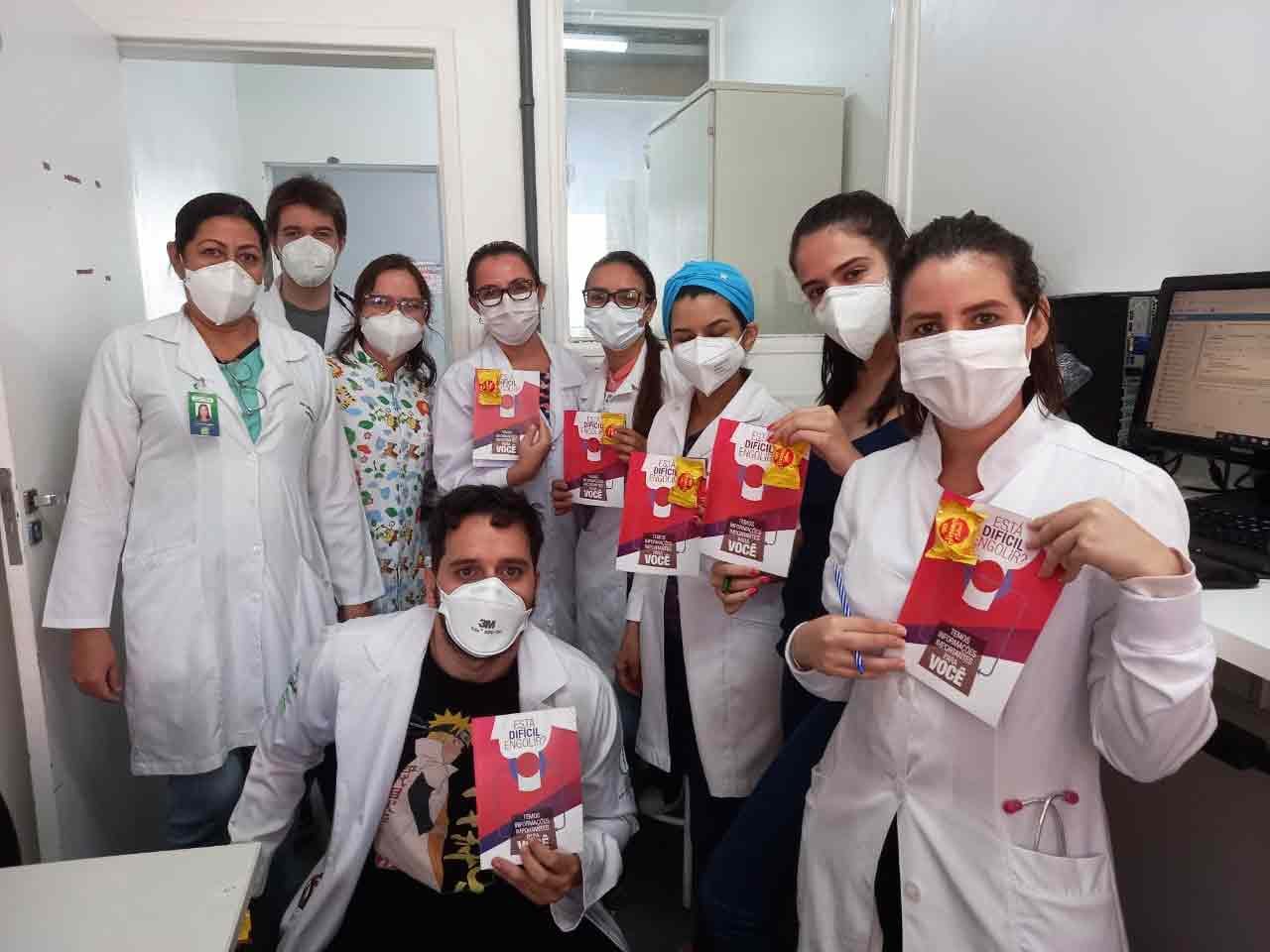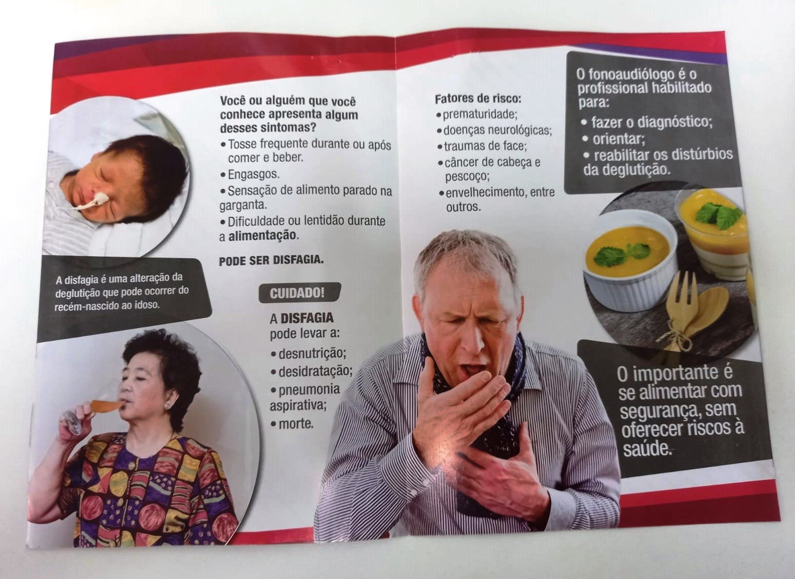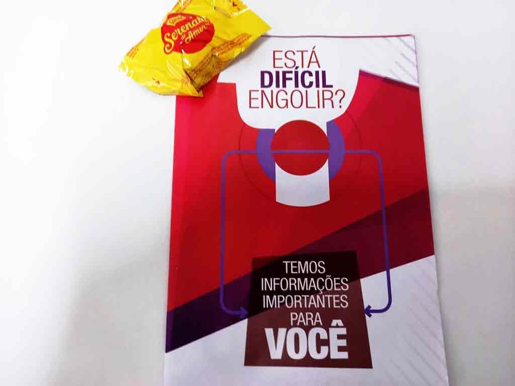 percorreram vários setores do hospital divulgando medidas de prevenção e o que fazer no caso de suspeita de disfagia. Além de orientar sobre a doença, as fonoaudiólogas entregaram um folheto informativo sobre a disfagia, junto com um bombom.