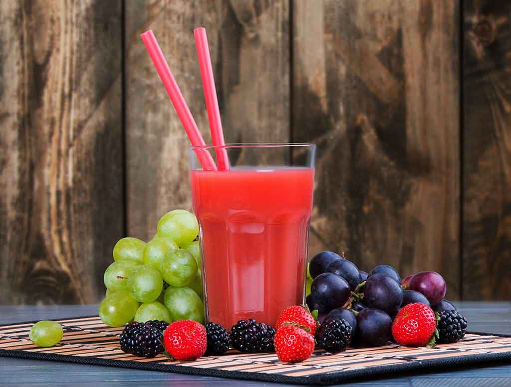 Bata no liquidificador os morangos, o suco de laranja, a uva e a água. Acrescente a água tônica delicadamente (sem bater) e sirva em seguida.