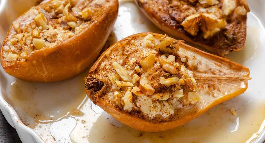 Corte a pera ao meio no sentido vertical e retire uma porção da polpa de modo a liberar espaço para adicionar recheio. Misture a aveia, o mel, as nozes e a polpa retirada da pera, formando uma massinha cremosa. Adicione essa mistura à pera e leve ao forno por 20 minutos, a 180ºC. Rende 2 porções