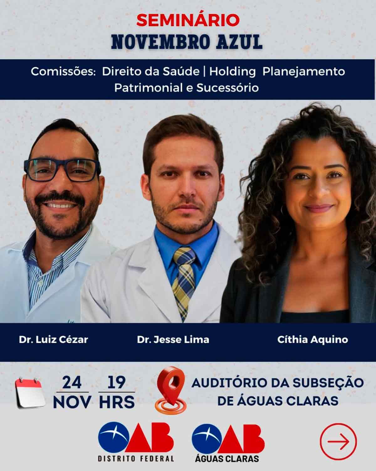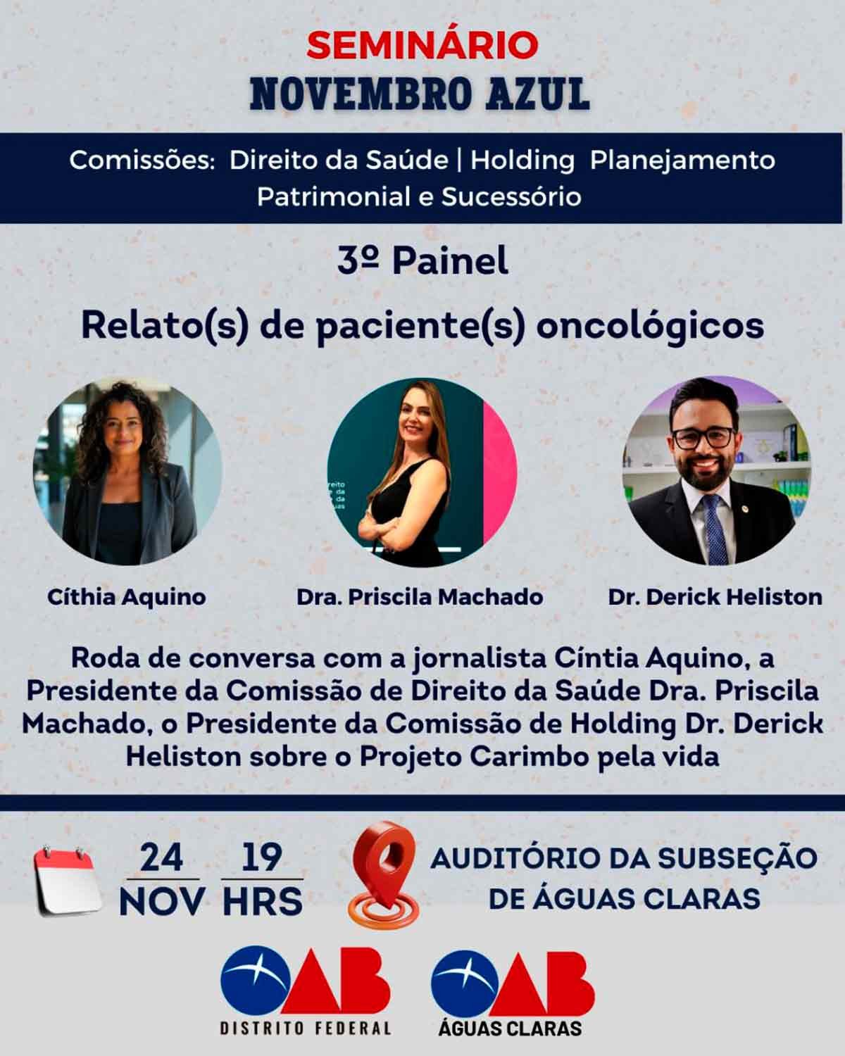 A Comissão de Direito da Saúde da OAB Subseção Águas Claras realiza, nesta noite, o Seminário Novembro Azul, reunindo especialistas, representantes de entidades públicas e vozes da sociedade civil para discutir políticas de atenção ao paciente oncológico.