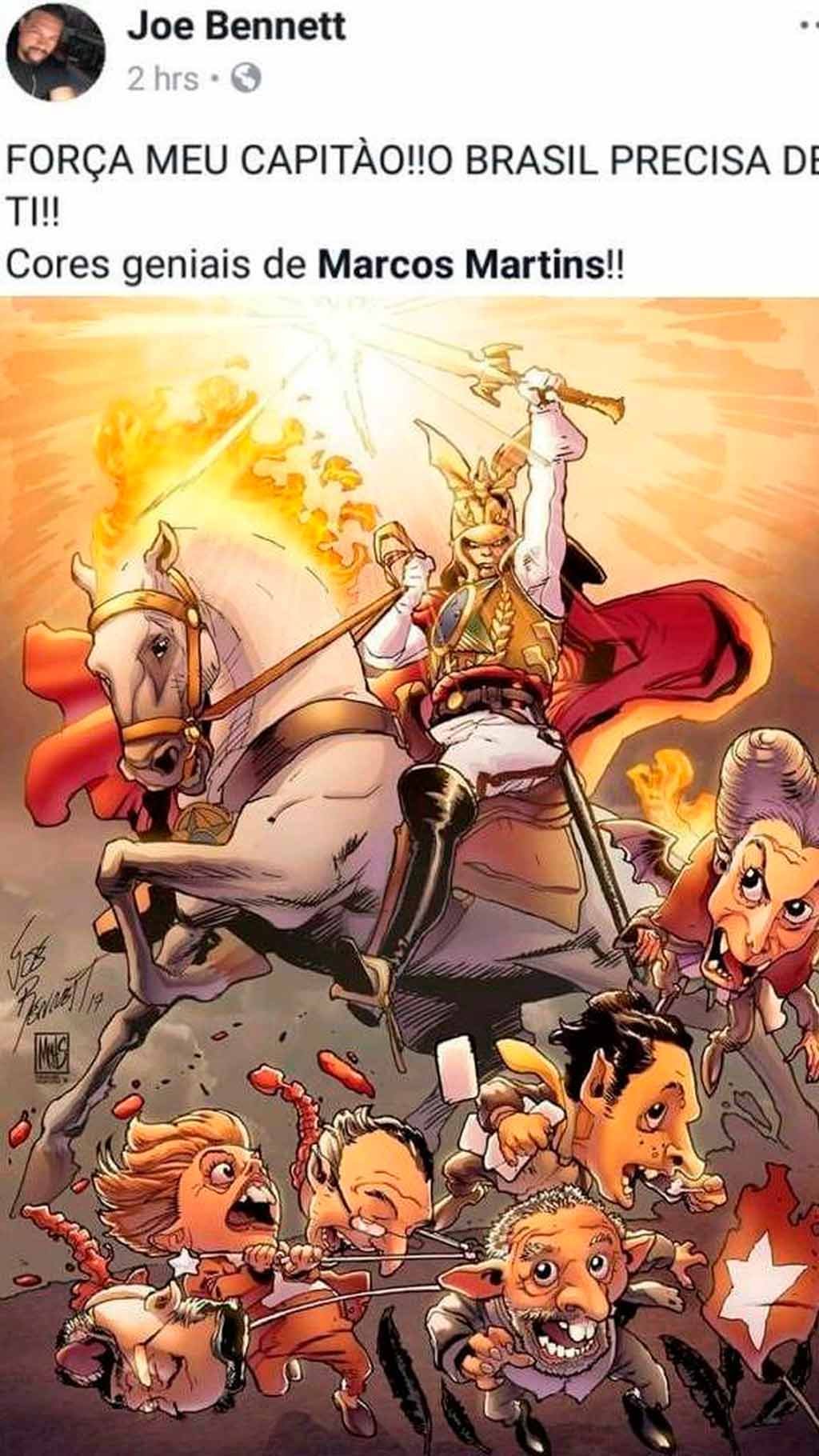 No desenho de Bennett, Bolsonaro é representado como um cavaleiro de armadura empunhando uma espada luminosa, enquanto alguns de seus adversários políticos como Lula, Dilma Rousseff e Aécio Neves, desenhados de forma caricata semelhante a ratos, fogem.