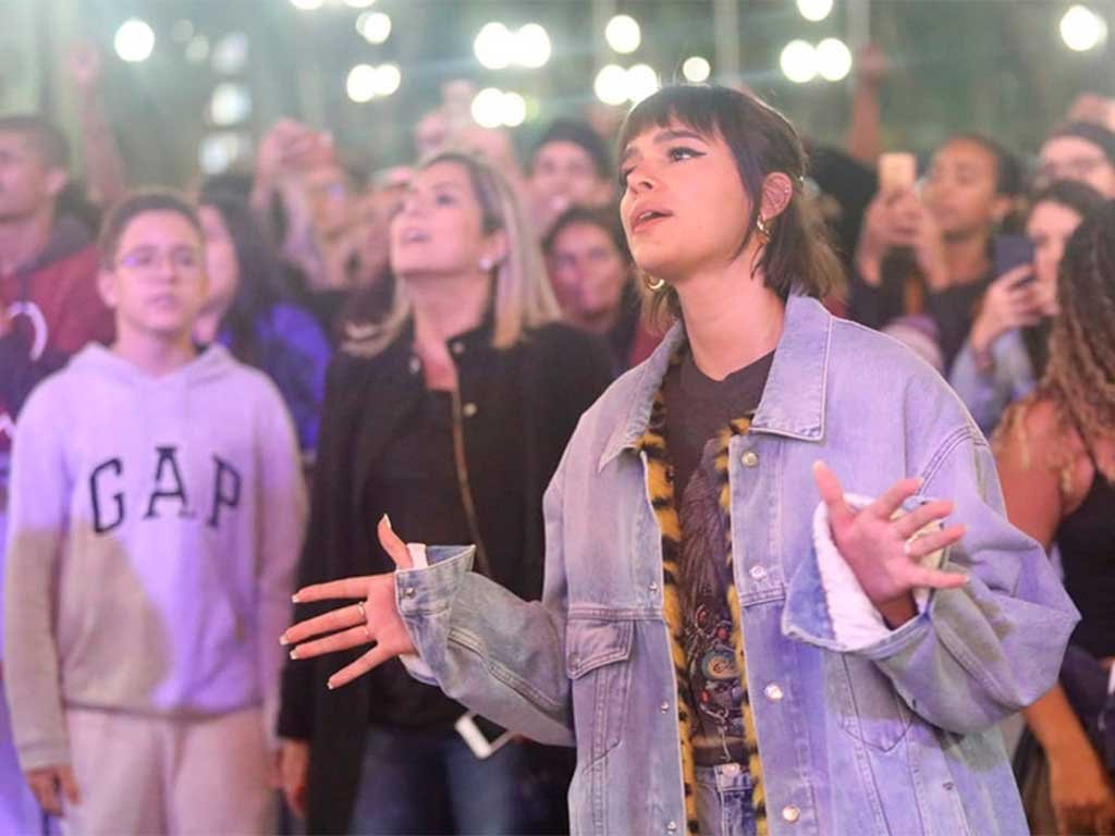 A atriz Bruna Marquezine assistiu de cima do palco a parte do show de Priscilla Alcântara na Virada Cultural, em São Paulo, na noite deste sábado (18). A cantora gospel abriu os shows de música cristã no palco montado na Praça da Sé, no Centro.