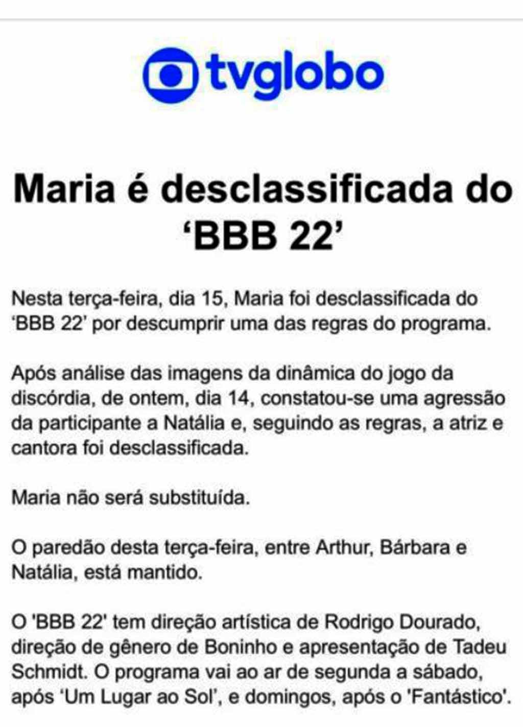Leia nota na íntegra  “Maria é desclassifica do ‘BBB 22’
