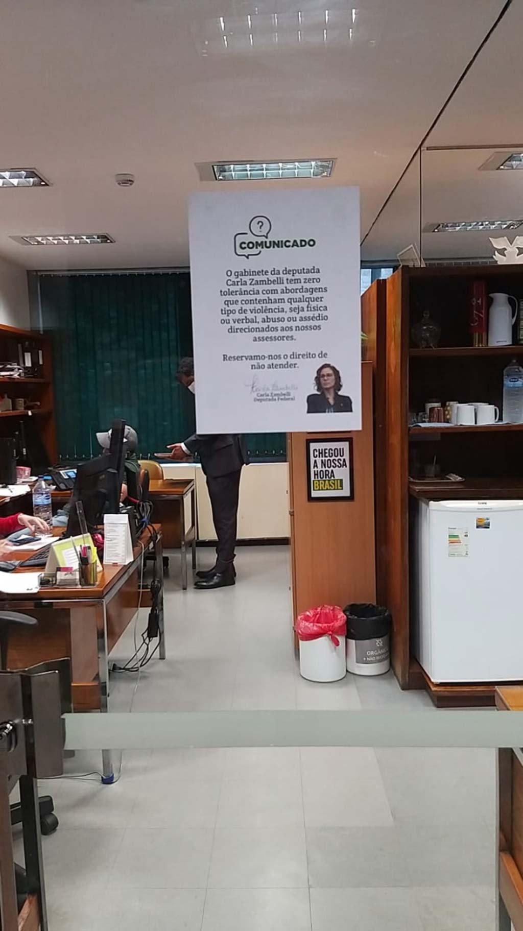 Por ordem da deputada Carla Zambelli, foi colocado, na porta de seu gabinete, o recado descrito na imagem .