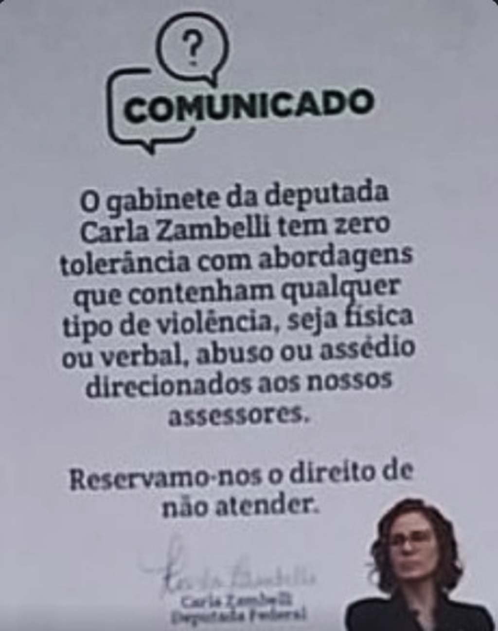 O recado foi colocado devido a episódios já ocorridos contra funcionários da equipe de Zambelli.
