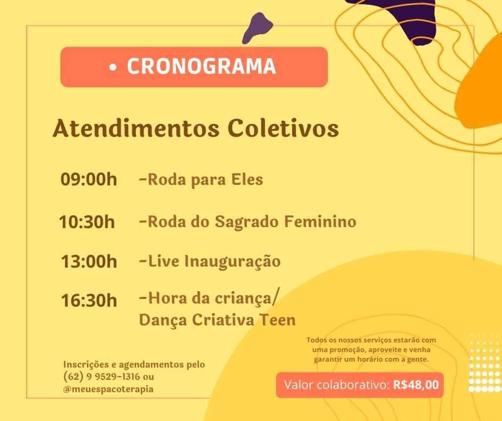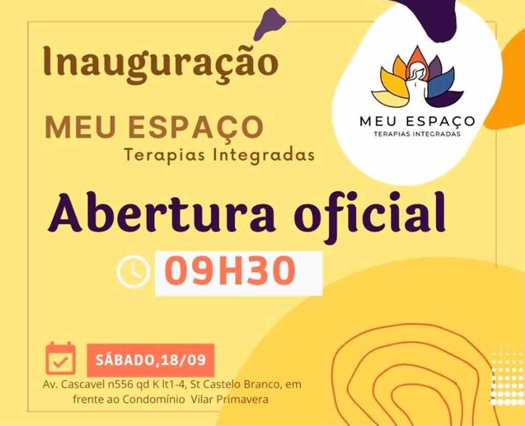 Será inaugurado amanhã, sábado(18/09) às 09H30  “Meu Espaço” Terapias Integradas, com atividades durante todo o dia na Av. Cascavel n°556 qd.K lt.1-4 Setor Castelo Branco em Goiânia.