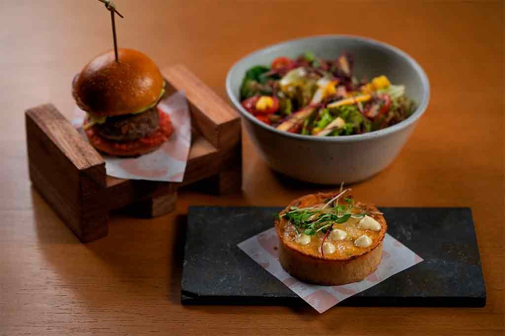 Salada tropical do Juá (folhas frescas, tomatinho cereja, manga verde, palmito de pupunha julienne, tapenade de azeitona e vinagrete de laranja); Nossa empadinha de camarão (massa crocante com aviú (mini camarões)), recheio de bobó de camarão, requeijão cremoso de limão china e saladinha de brotos) ou X Salada do Juá + Mafuá (mini burger de ancho serenado, paio, picles de abacaxi, passata de tomate, batata palha da casa e maionese de ervas)
