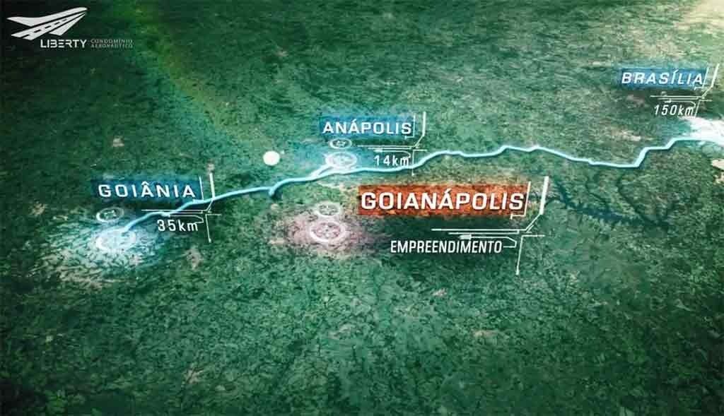 O local reúne 158 lotes de 1.804 m2 a 5.418 m2 em torno de uma pista de aproximadamente 1.640 m X 30 m PCN28 , com capacidade para receber até grandes jatos executivos, numa localização privilegiada , em um dos Principais Eixos de Desenvolvimento do Brasil, Goiânia Anápolis e Brasilia, situado na margem direita da Rodovia Go- 415 e a 5 Km de Goianápolis, 10 Km de Anápolis e 140 km de Brasilia .