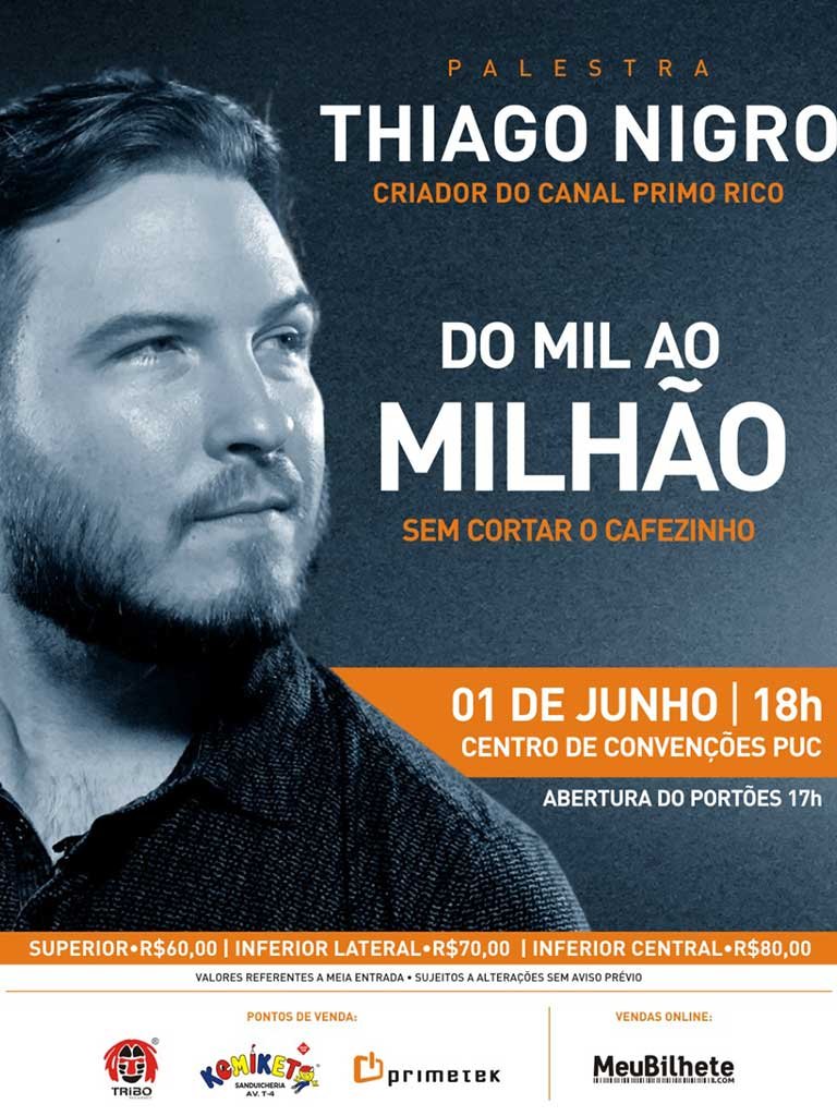 A palestra terá o tema do livro “Do Mil ao Milhão – sem cortar o cafezinho (2018)”, onde Thiago Nigro relata em 222 páginas, de uma forma simples e de fácil leitura, rico conteúdo.
