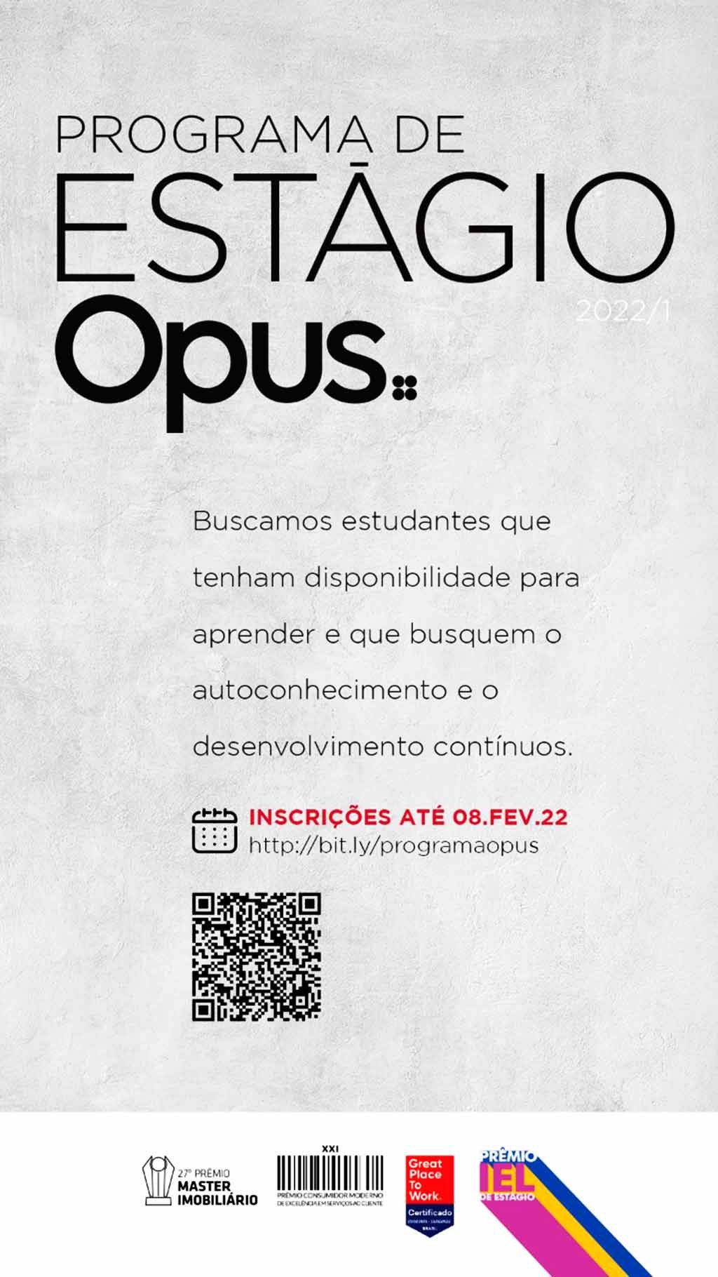 A Opus Incorporadora irá receber até 8 de fevereiro inscrições para 10 vagas de estágio para estudantes dos cursos de engenharia, arquitetura, administração, contabilidade e direito. A empresa, que já ganhou o Prêmio IEL de Estágio por duas vezes, tem flexibilidade de horário para que o aluno consiga conciliar o estágio com a graduação, concede vale-transporte e bolsa de um salário mínimo.