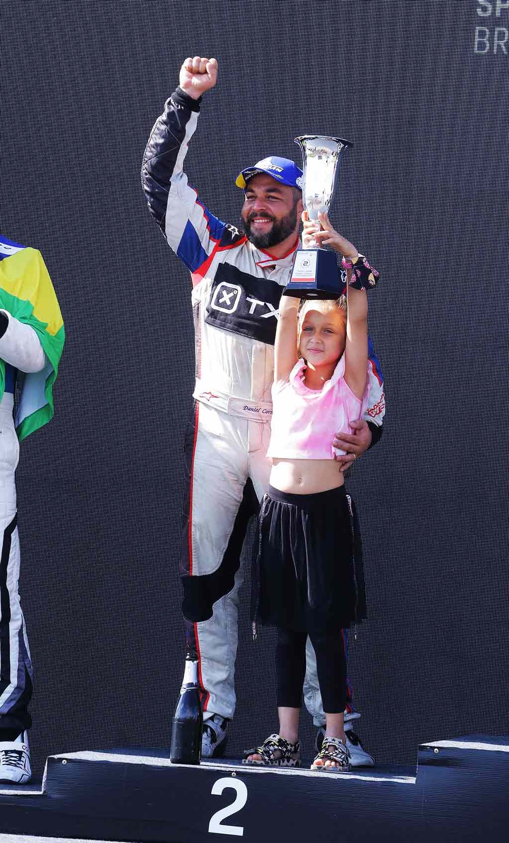 comemorou os resultados com sua filha Luna, que o acompanha nas corridas e posou ao lado do pai, segurando o troféu.