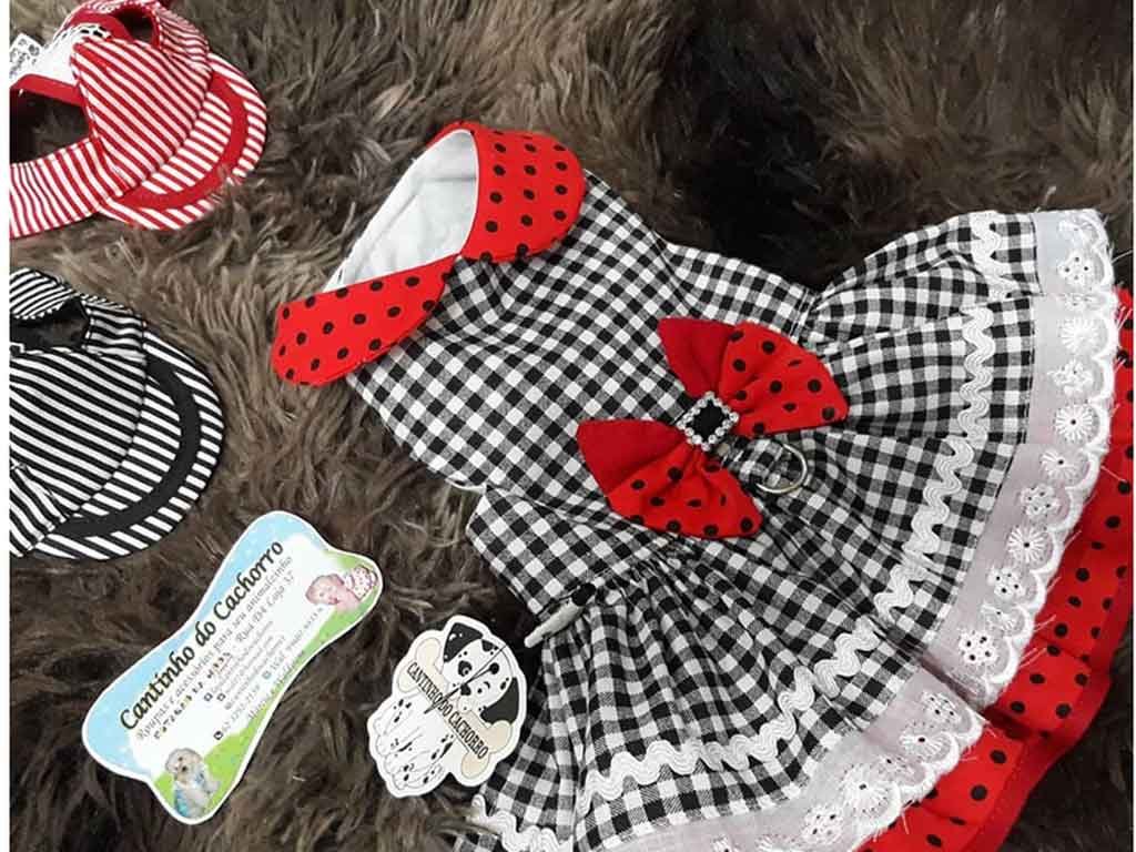Os vestidos com laços e tecido estampado também estão entre os mais procurados e trazem mais charme e elegância para as fêmeas, enquanto os bodys com colete e gravata conferem formalidade para os pets machos.