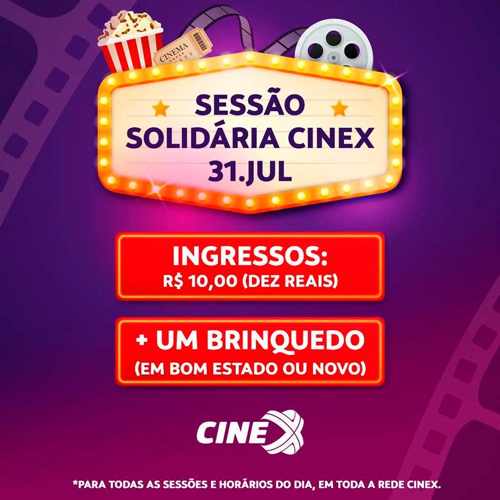 Os ingressos para a Sessão Solidária já estão disponíveis para aquisição pelo valor promocional no site cinex.art.br, para todas as unidades do Brasil e fisicamente na bilheteria do cinema. A entrega do brinquedo deve ser realizada ao menos 30 minutos antes do filme escolhido, na própria unidade.