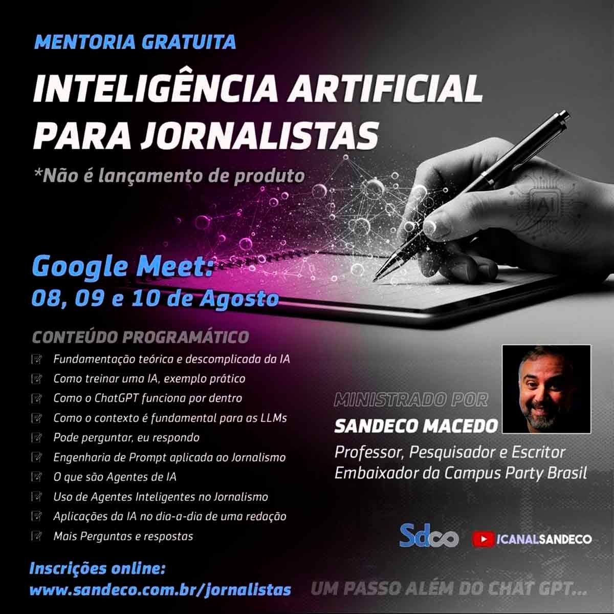 Nos dias 8, 9 e 10 de agosto, eu, Sandeco, jornalista e especialista em comunicação, terei o prazer de conduzir uma mentoria gratuita original com foco em Inteligência Artificial aplicada ao jornalismo.