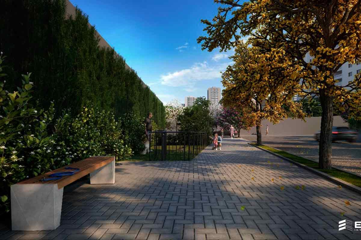 Ao fundo, terá um bosque, que será desenvolvido junto com o pet place e os espaços de convivência, totalizando mais de 1000 metros quadrados de área privada que serão compartilhadas com a vizinhança.