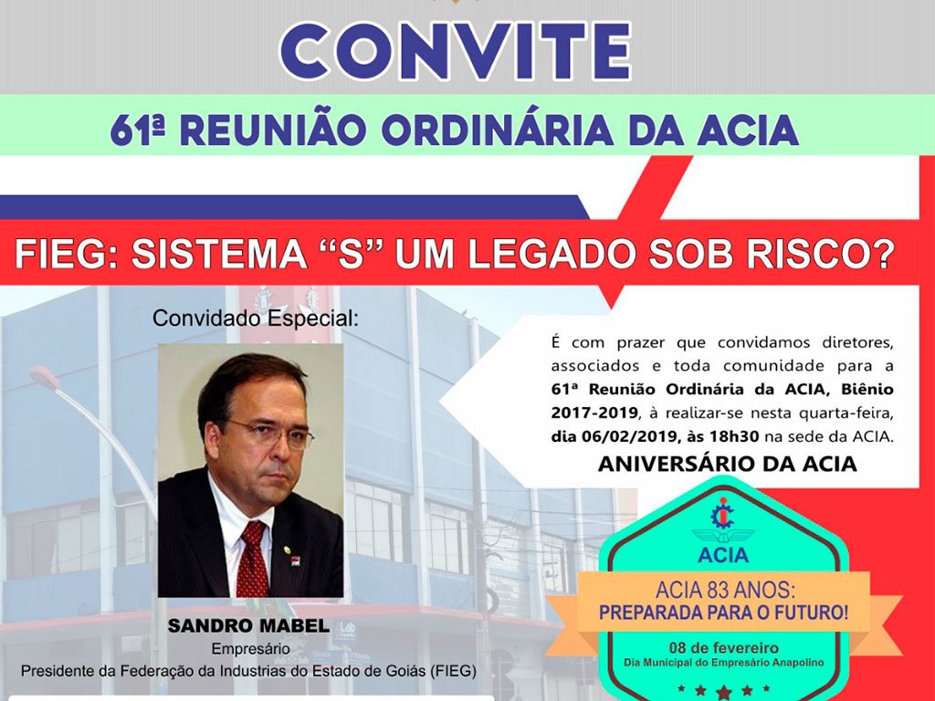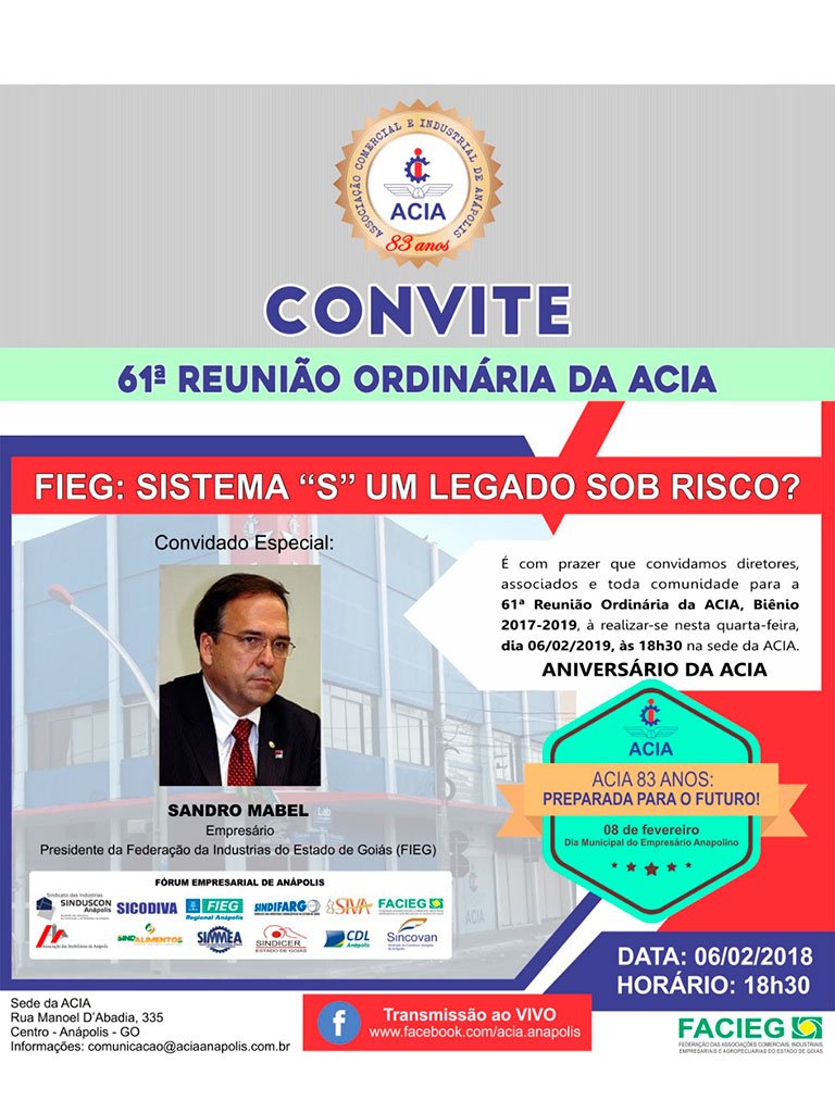 A primeira Reunião Ordinária de 2019 da Associação Comercial e Industrial de Anápolis será em comemoração ao Aniversário de 83 anos da ACIA e para celebrar a data, o palestrante será o novo presidente da Federação das Indústrias do Estado de Goiás (FIEG), o empresário Sandro Mabel Scodro.