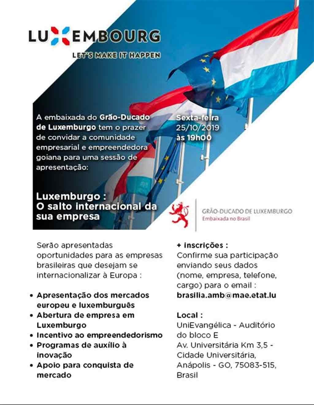 Pela primeira vez no estado de Goiás, a embaixada luxemburguesa realizará na próxima sexta-feira (25 de outubro) o evento Luxemburgo: o salto internacional da sua empresa, na cidade de Anápolis.