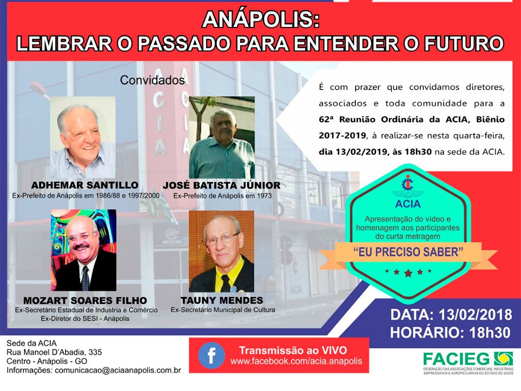 A 62ª Reunião Ordinária da Associação Comercial e Industrial de Anápolis será dedicada em resgatar a memória da história de Anápolis e na oportunidade a ACIA irá homenagear os ex-prefeitos: José Batista Júnior e Adhemar Santillo; o ex-secretário estadual de indústria e comércio, Mozart Soares Filho e o ex- secretário de cultura, Tauny Mendes.