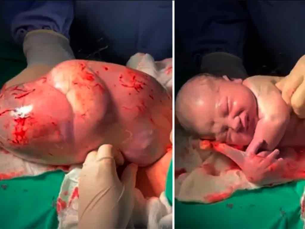 Bebê nasce empelicado e médico faz cócegas na barriga dele para acordá-lo