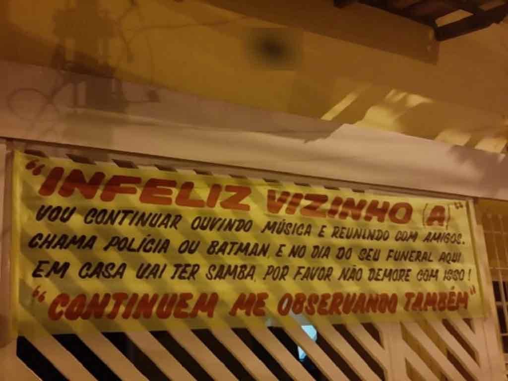 “Infeliz vizinho (a), vou continuar ouvindo música e reunindo com amigos. Chama polícia ou Batman. E no seu funeral aqui em casa vai ter samba, por favor não demore com isso! Continuem me observando”, relata o texto exposto pela moradora.