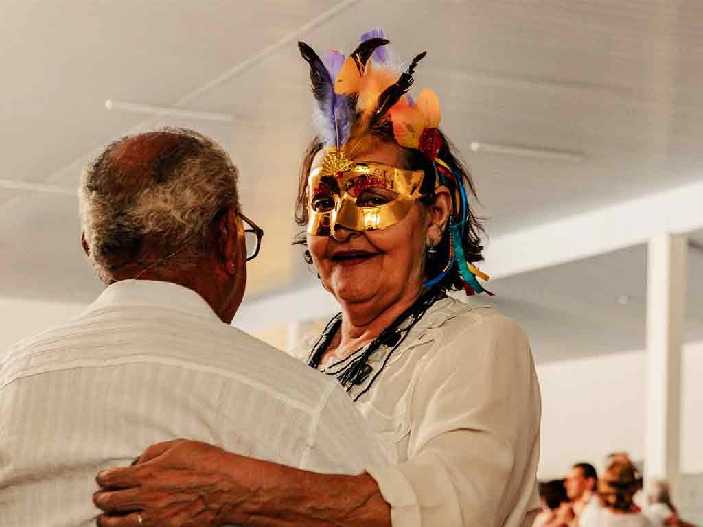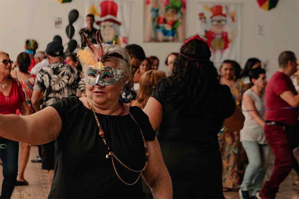 os idosos capricharam nas fantasias. Geralda Maria, de 69 anos, investiu no figurino completo, com peruca, máscara e roupas coloridas. Estampou um sorriso no rosto para dançar e brincar com todos os amigos. “Foi maravilhoso, é a coisa melhor que tem, a gente esquece tudo”, disse.