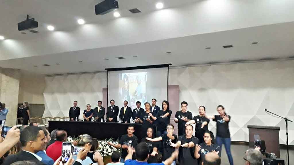 O ato solene teve início com a composição da mesa e a apresentação do Hino do Excepcional pelos alunos da Escola Maria Montessori.
