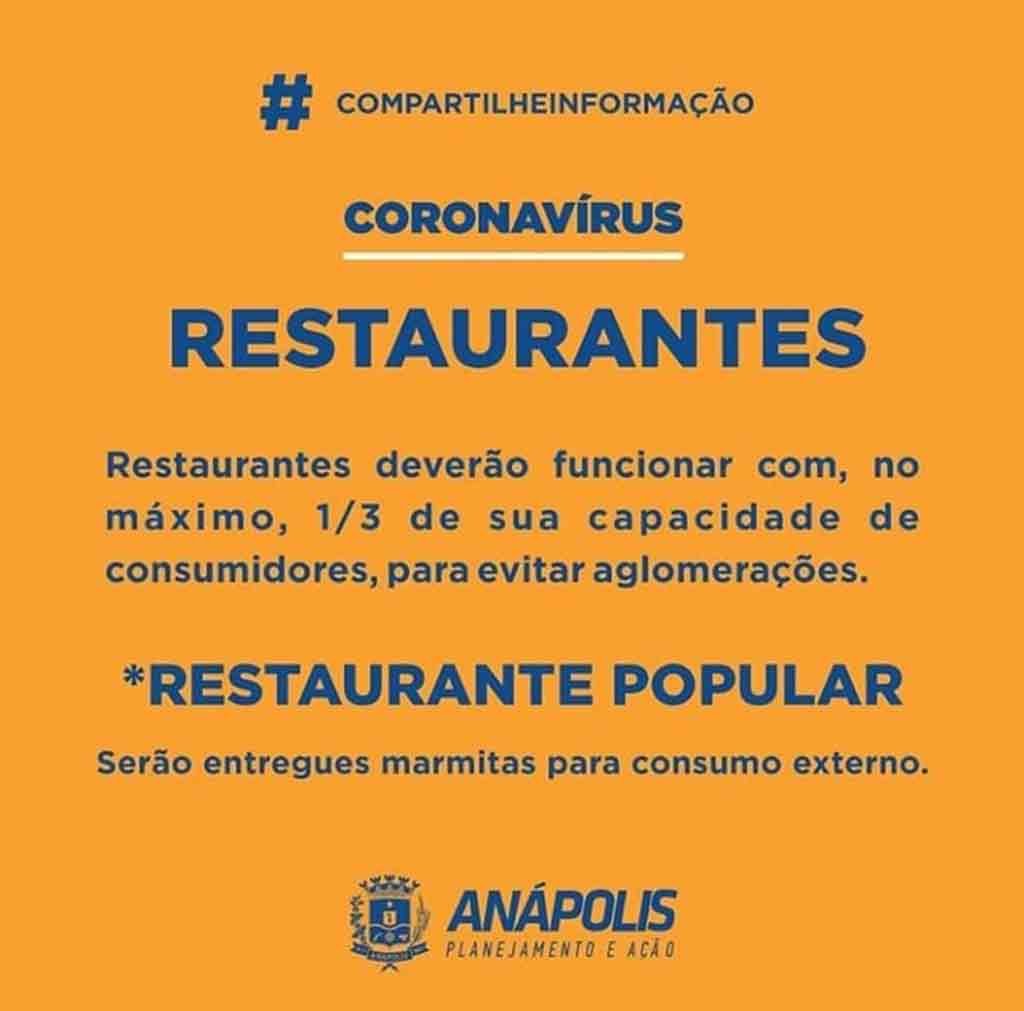 À exceção do Restaurante Popular, que fará entrega de marmitas e marmitex para o consumo externo, os restaurantes do município poderão funcionar com lotação máxima de 1/3 da capacidade de consumidores.