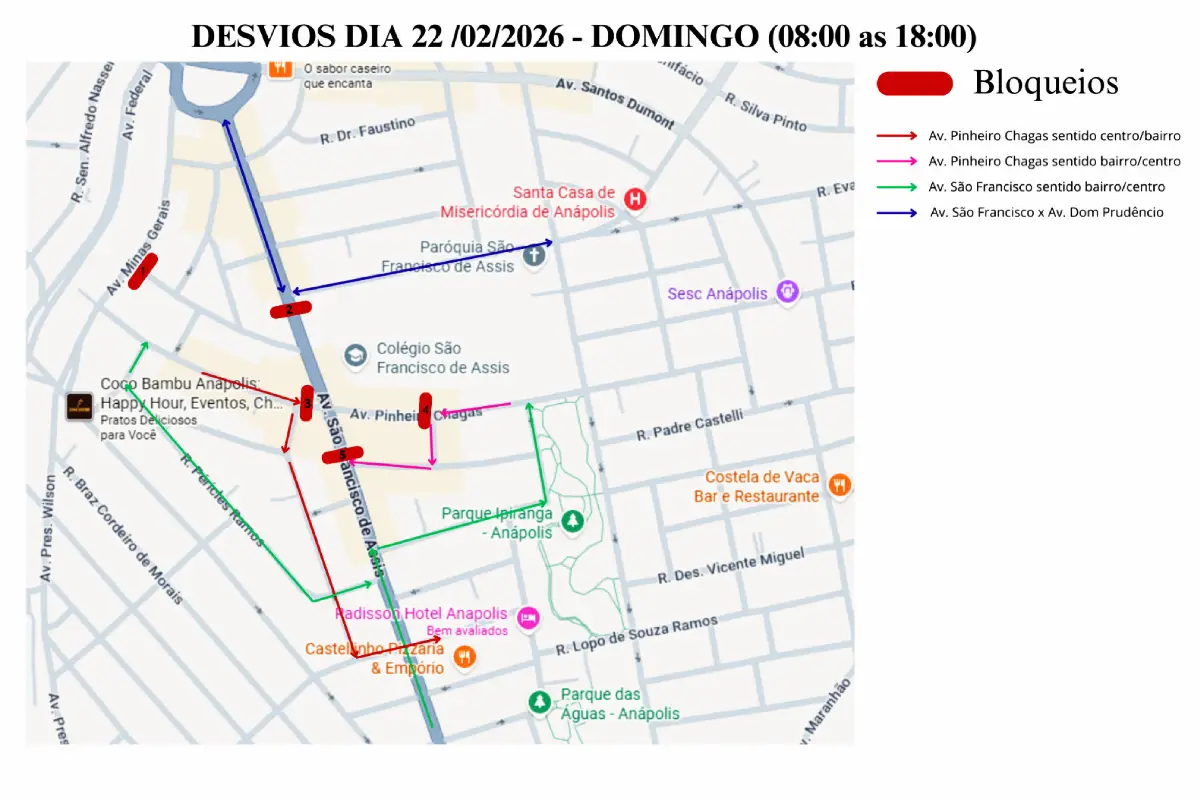 No sábado (21), entre 13h e 18h, será necessário interromper o fluxo de veículos na Rua Padre Luiz dos Anjos. A CMTT sugere que os motoristas utilizem a Avenida Minas Gerais e a Avenida Pinheiro Chagas, além da própria Avenida São Francisco – sendo todas de sentido duplo.