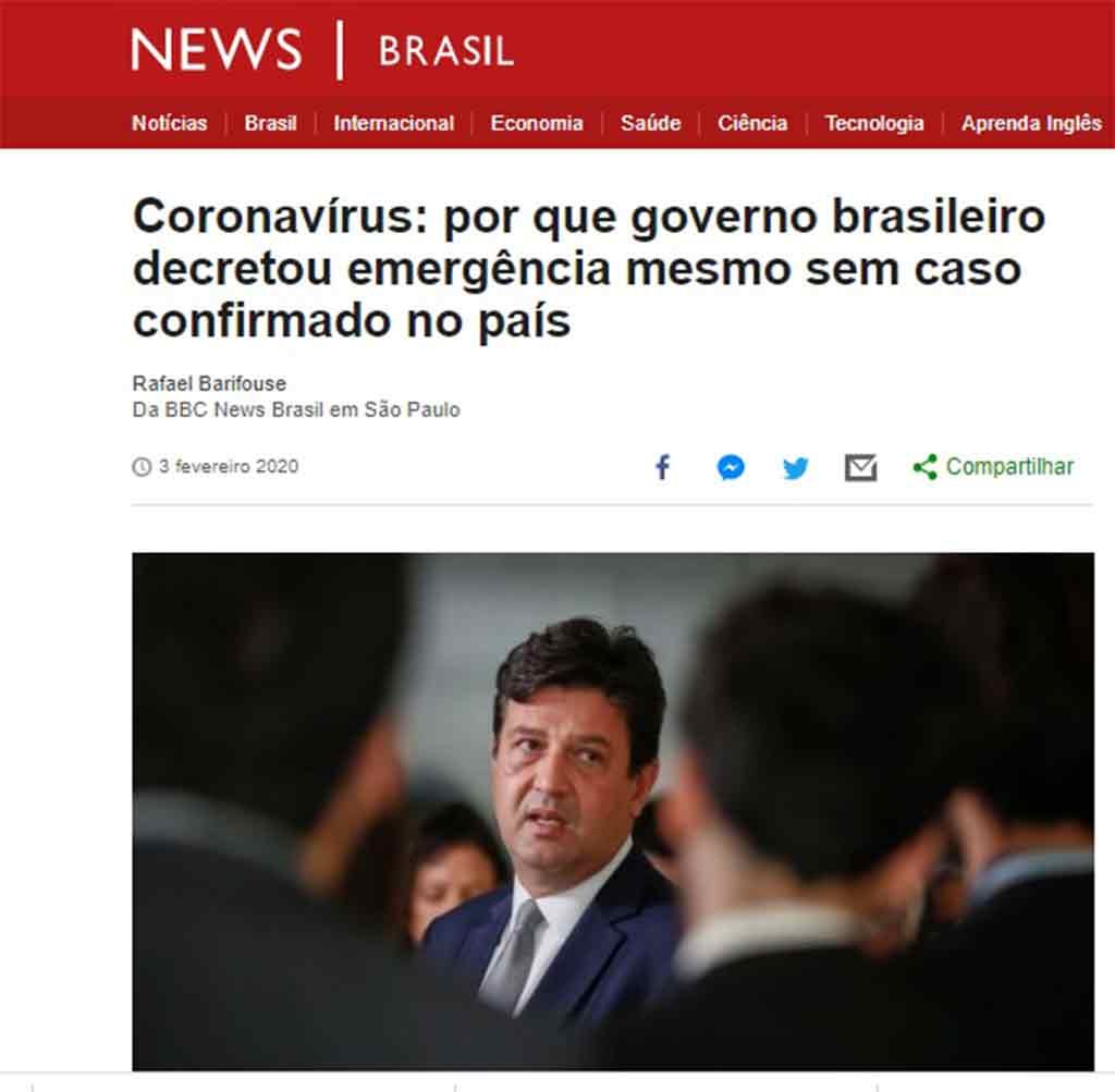 BBC News Brasil 03/02 : O governo federal decretou por meio de uma portaria publicada nesta terça-feira (04/02) uma situação de emergência no Brasil em meio à epidemia de Coronavírus mesmo sem a confirmação de um caso no país.