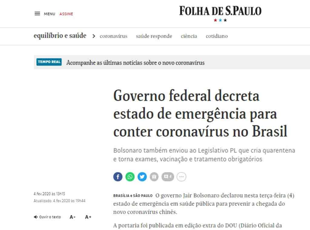 Folha de São Paulo 04/02: Governo federal decreta estado de emergência para conter coronavírus no Brasil. Bolsonaro também enviou ao Legislativo PL que cria quarentena e torna exames, vacinação e tratamento obrigatórios.