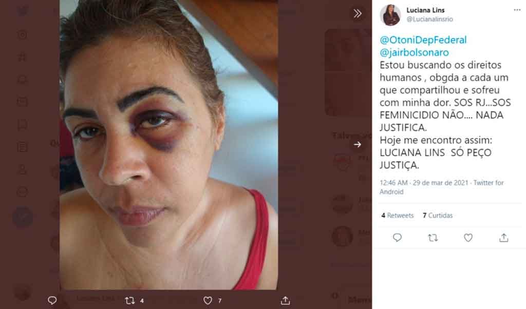 Luciana também usou as redes sociais para expor os machucados e pedir ajuda. “Estou buscando os direitos humanos”, escreveu a empresária em postagem no twitter onde marcou o perfil do Presidente da República.